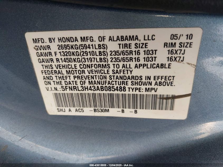 Колір СинійЦиліндри 6Привід Передній привідVIN 5FNRL3H43AB085488Стан Заводиться та їде (перевірено)Ушкодження Задня AutoRIA