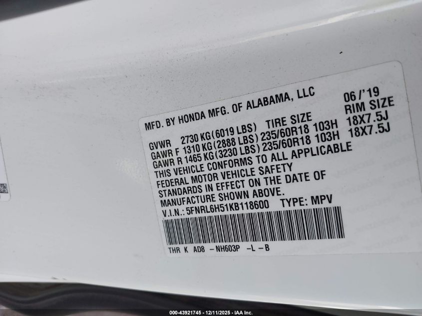 2019 HONDA ODYSSEY 2019 року Бензин, 3.5, Передній привід, vin - 5FNRL6H51KB118600 з США