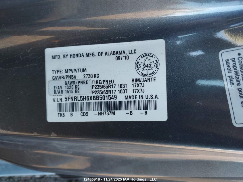 Колір СірийЦиліндри 6Привід Передній привідVIN 5FNRL5H6XBB501549Стан Заводиться та їде (перевірено)Ушкодження ПередняДата аукціону 2025-12-08 AutoRIA