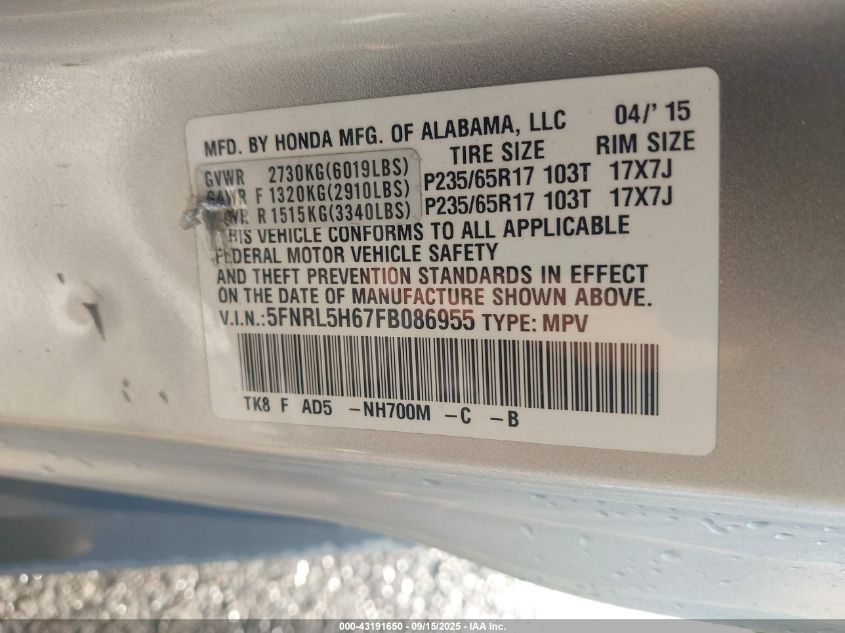 Колір СрібнийЦиліндри 6Привід Передній привідVIN 5FNRL5H67FB086955Стан Заводиться та їде (перевірено)Ушкодження Задня права AutoRIA