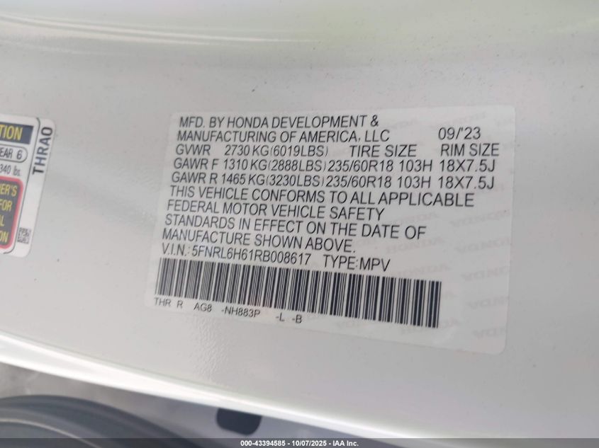2024 HONDA ODYSSEY 2024 року Бензин, 3.5, Передній привід, vin - 5FNRL6H61RB008617 з США