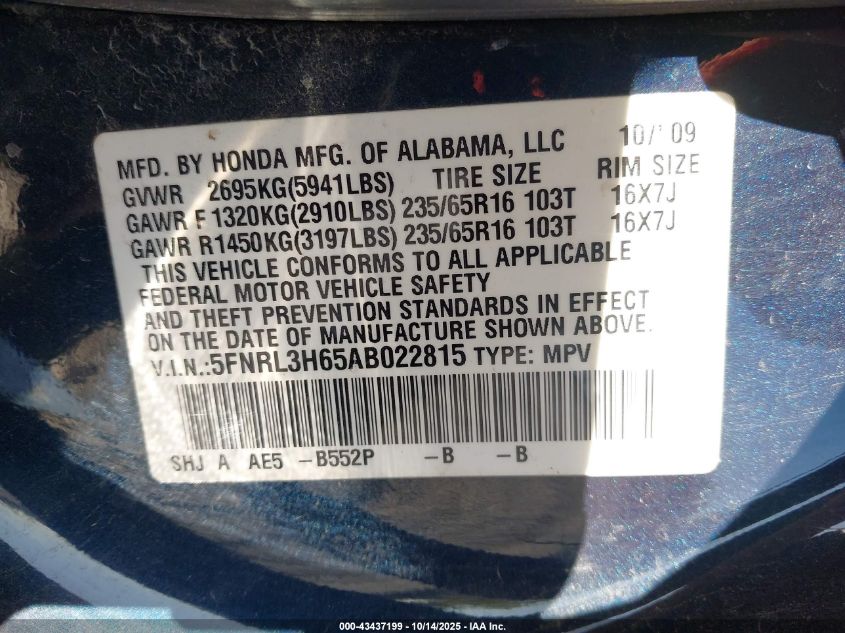 Колір СинійЦиліндри 6Привід Передній привідVIN 5FNRL3H65AB022815Стан Заводиться та їде (перевірено)Ушкодження Механічні пошкодження AutoRIA