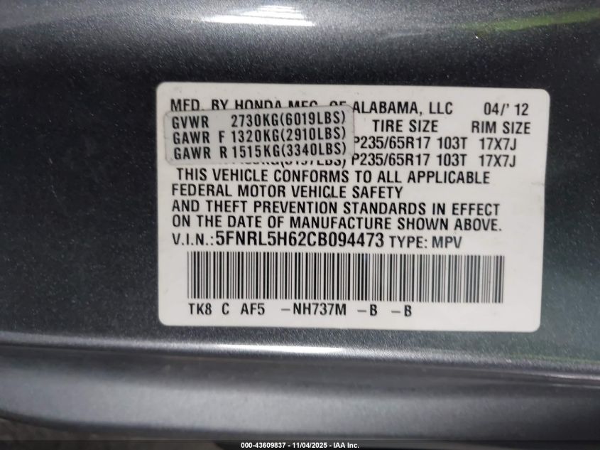 Колір СірийЦиліндри 6Привід Передній привідVIN 5FNRL5H62CB094473Стан Заводиться та їде (перевірено)Ушкодження ЗадняДата аукціону 2025-12-09 AutoRIA