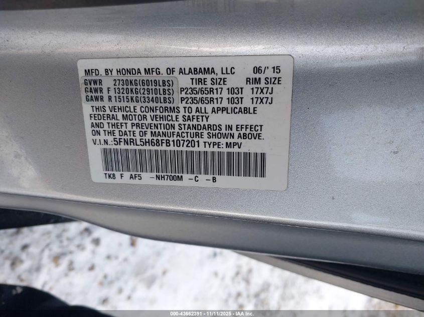 2015 HONDA ODYSSEY 2015 року Бензин, 3.5, Передній привід, vin - 5FNRL5H68FB107201 з США