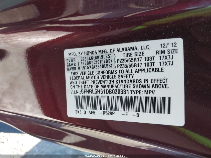 Колір ЧервонийЦиліндри 6Привід Передній привідVIN 5FNRL5H61DB030331Стан Заводиться та їде (перевірено)Ушкодження Ліва сторона AutoRIA