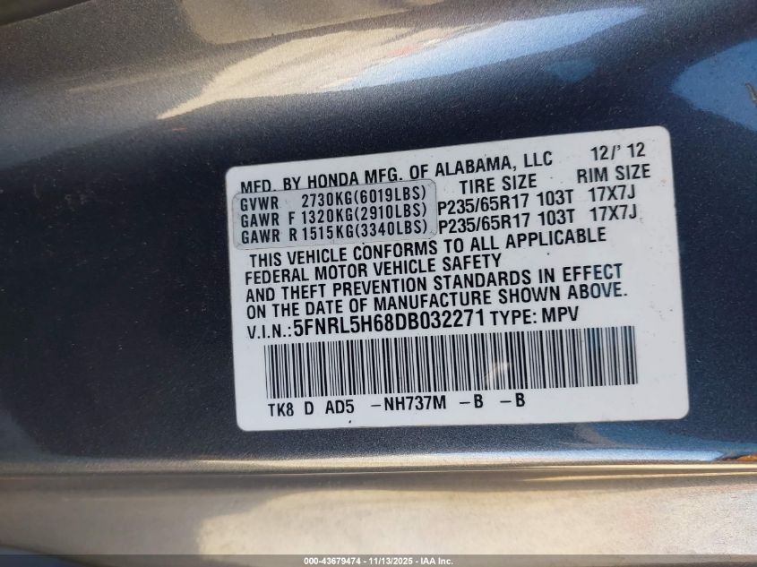 Колір СірийЦиліндри 6Привід Передній привідVIN 5FNRL5H68DB032271Стан Заводиться та їде (перевірено)Ушкодження Передня праваДата аукціону 2025-12-11 AutoRIA