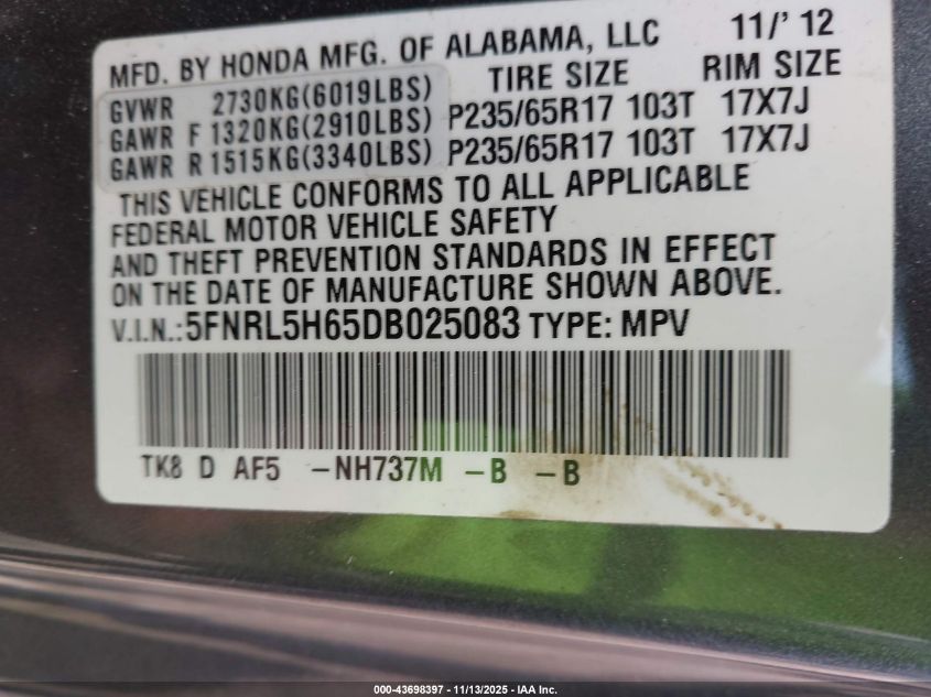 Колір СірийЦиліндри 6Привід Передній привідVIN 5FNRL5H65DB025083Стан СтаціонарноУшкодження Права сторонаДата аукціону 2025-12-10 AutoRIA