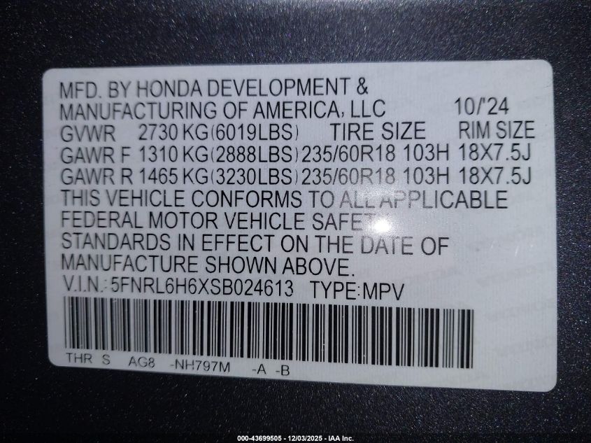 2025 HONDA ODYSSEY 2025 року Бензин, 3.5, Передній привід, vin - 5FNRL6H6XSB024613 з США
