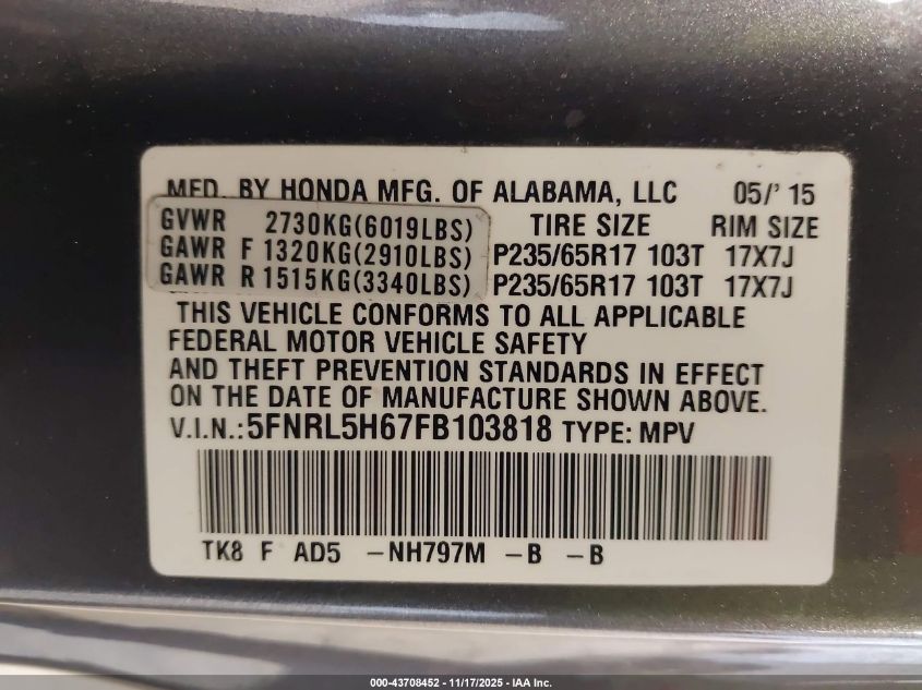 Колір СірийЦиліндри 6Привід Передній привідVIN 5FNRL5H67FB103818Стан Заводиться та їде (перевірено)Ушкодження Передня або задняДата аукціону 2025-12-08 AutoRIA