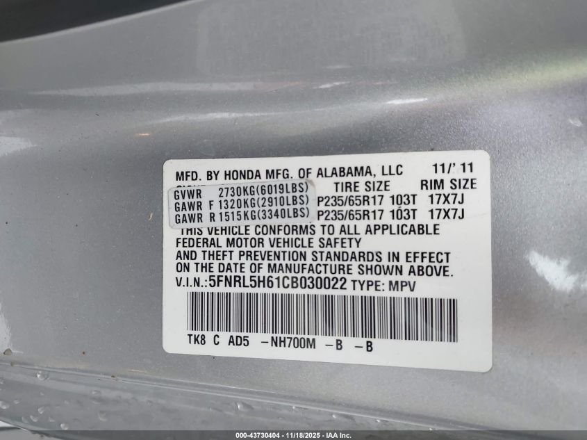 Колір СрібнийЦиліндри 6Привід Передній привідVIN 5FNRL5H61CB030022Стан Заводиться та їде (перевірено)Ушкодження Права сторона AutoRIA