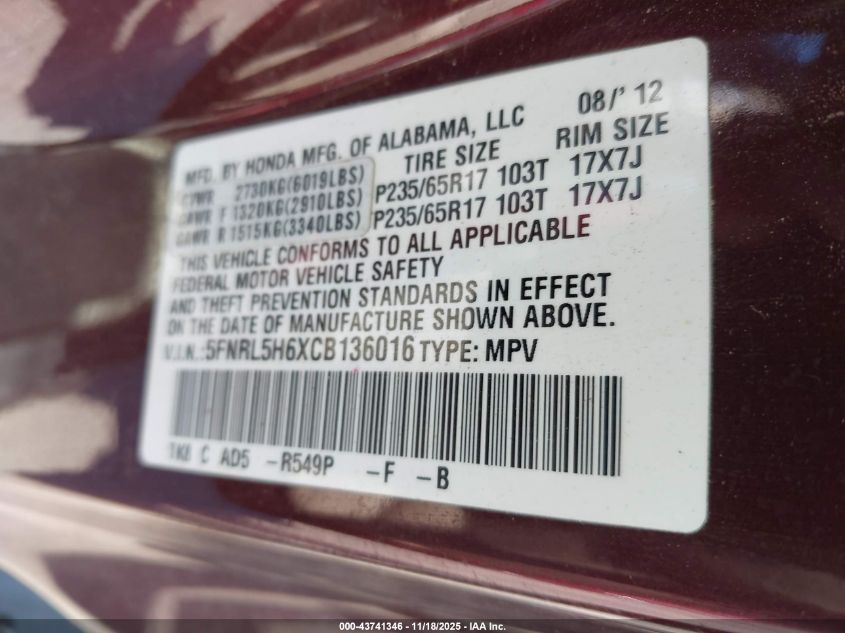 Колір БургундіяЦиліндри 6Привід Передній привідVIN 5FNRL5H6XCB136016Стан Заводиться та їде (перевірено)Ушкодження Звичайний зносДата аукціону 2025-12-10 AutoRIA