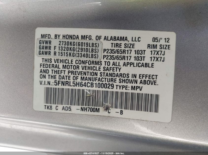 Колір СрібнийЦиліндри 6Привід Передній привідVIN 5FNRL5H64CB100029Стан Заводиться та їде (перевірено)Ушкодження Передня і задня AutoRIA