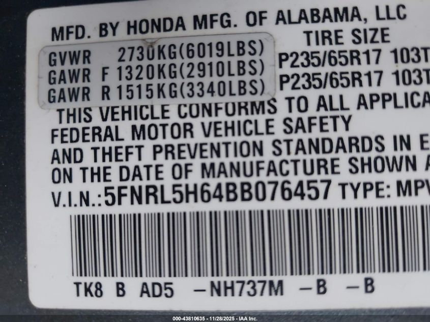 Колір СрібнийЦиліндри 6Привід Передній привідVIN 5FNRL5H64BB076457Стан ЗаводитьсяУшкодження Передня або задня AutoRIA