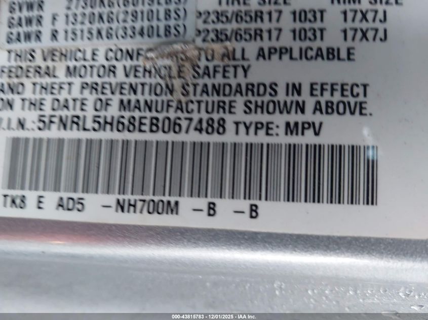 Колір СрібнийЦиліндри 6Привід Передній привідVIN 5FNRL5H68EB067488Стан Заводиться та їде (перевірено)Ушкодження Передня або задня AutoRIA