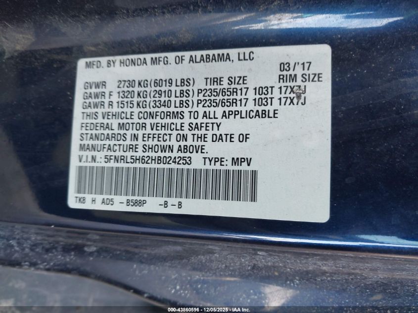Колір СинійЦиліндри 6Привід Передній привідVIN 5FNRL5H62HB024253Стан СтаціонарноУшкодження Передня або задня AutoRIA