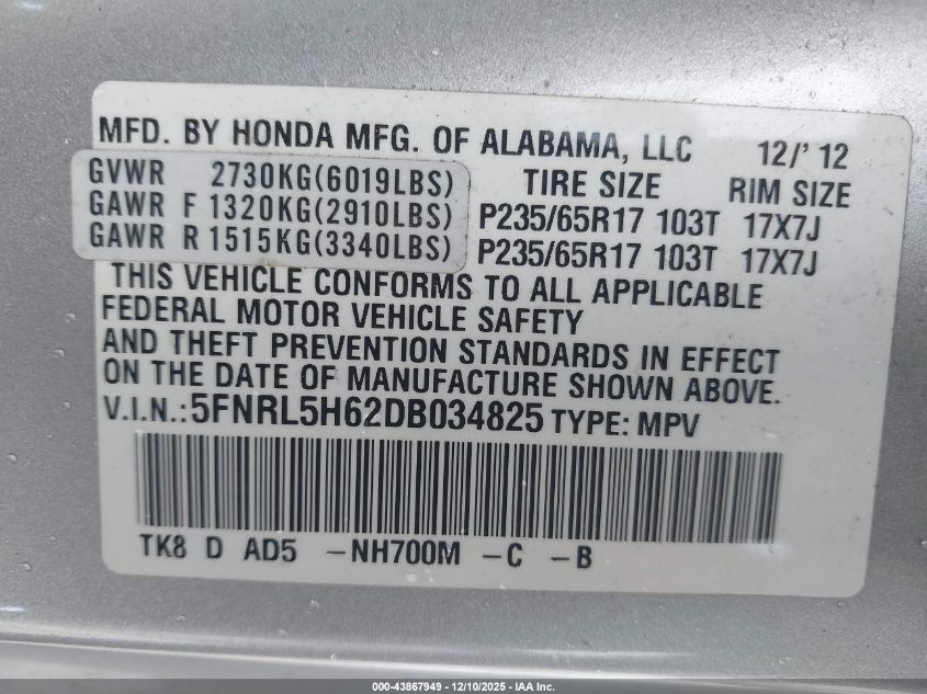 Колір СрібнийЦиліндри 6Привід Передній привідVIN 5FNRL5H62DB034825Стан СтаціонарноУшкодження Пожежа двигуна AutoRIA
