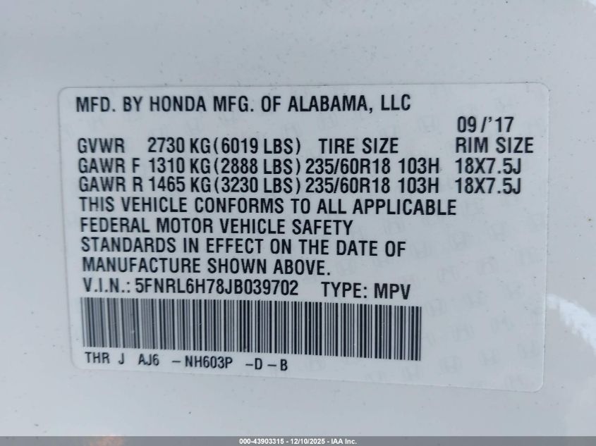 2018 HONDA ODYSSEY 2018 року Бензин, 3.5, Передній привід, vin - 5FNRL6H78JB039702 з США