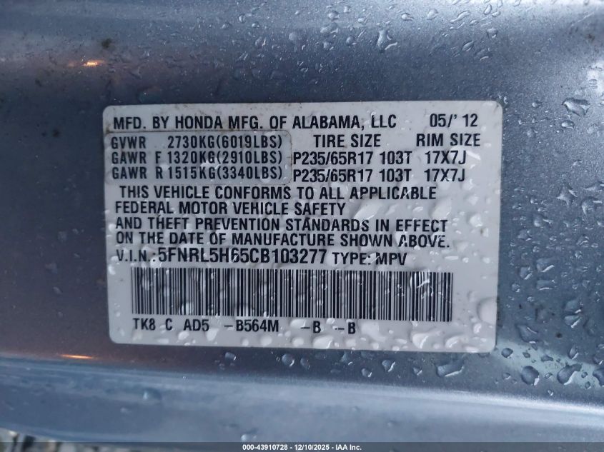 Колір СинійЦиліндри 6Привід Передній привідVIN 5FNRL5H65CB103277Стан Заводиться та їде (перевірено)Ушкодження Ліва сторона AutoRIA