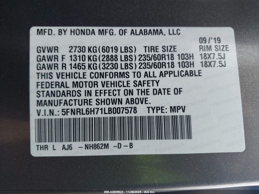2020 HONDA ODYSSEY 2020 року Бензин, 3.5, Передній привід, vin - 5FNRL6H71LB007578 з США