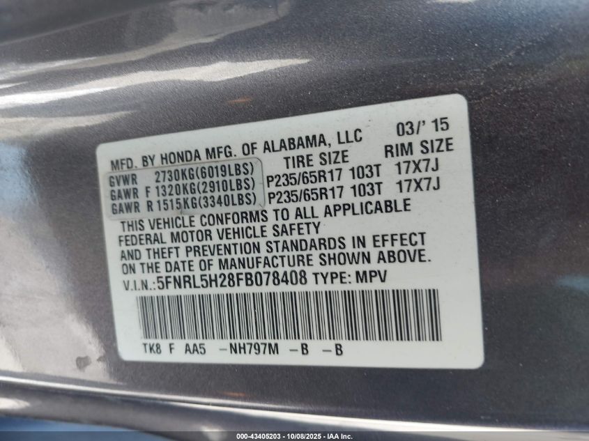 2015 HONDA ODYSSEY 2015 року Бензин, 3.5, Передній привід, vin - 5FNRL5H28FB078408 з США