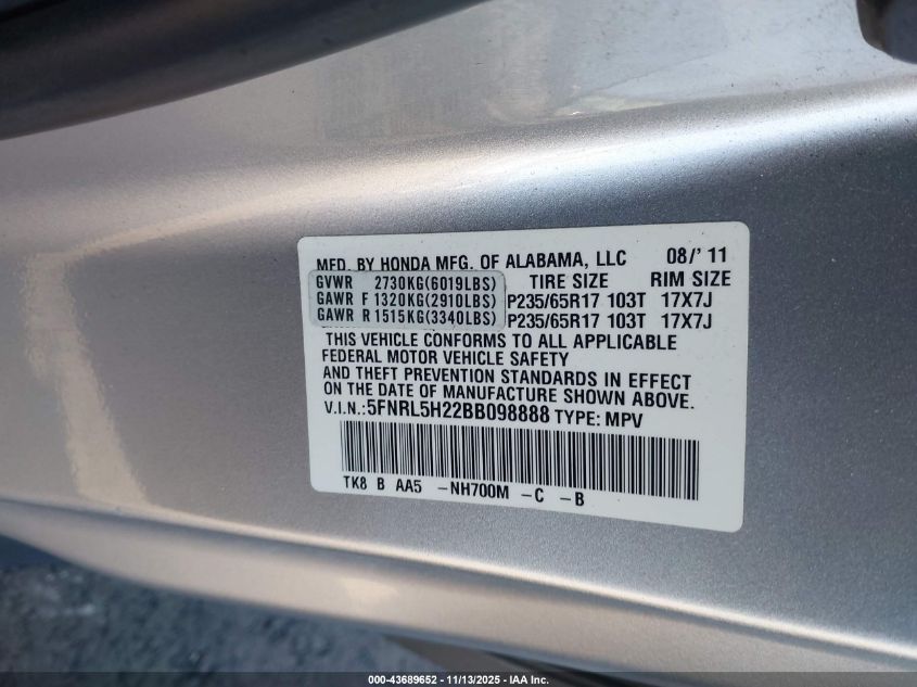 Колір СрібнийЦиліндри 6Привід Передній привідVIN 5FNRL5H22BB098888Стан Заводиться та їде (перевірено)Ушкодження Права сторона AutoRIA