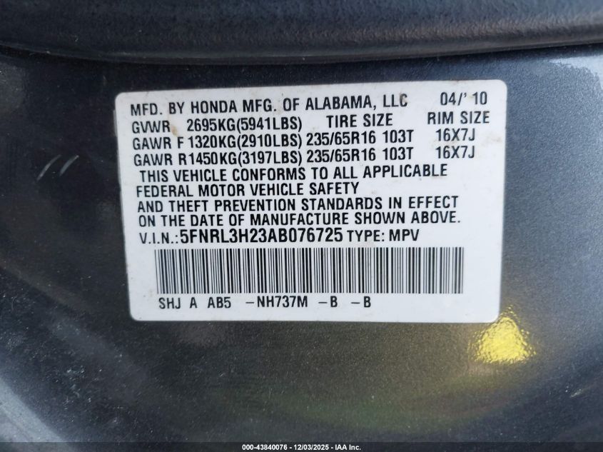 Колір СірийЦиліндри 6Привід Передній привідVIN 5FNRL3H23AB076725Стан ЗаводитьсяУшкодження По всьому авто AutoRIA