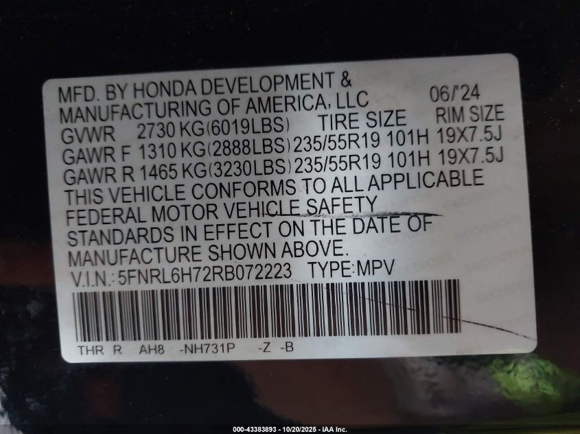 2024 HONDA ODYSSEY 2024 року Бензин, 3.5, Передній привід, vin - 5FNRL6H72RB072223 з США