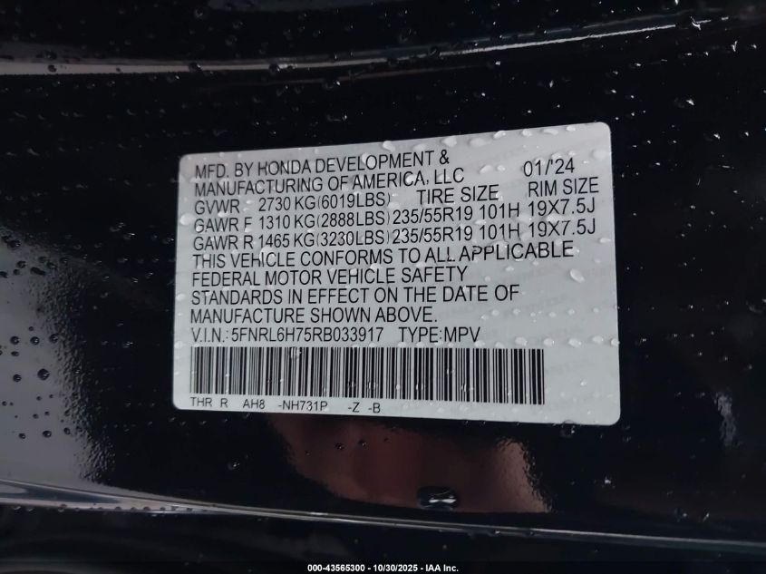 2024 HONDA ODYSSEY 2024 року Бензин, 3.5, Передній привід, vin - 5FNRL6H75RB033917 з США