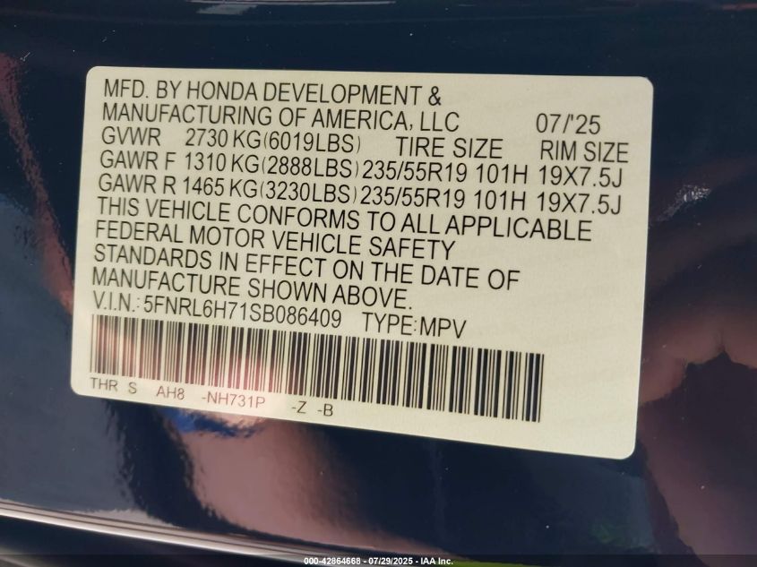 2025 HONDA ODYSSEY 2025 року Бензин, 3.5, Передній привід, vin - 5FNRL6H71SB086409 з США
