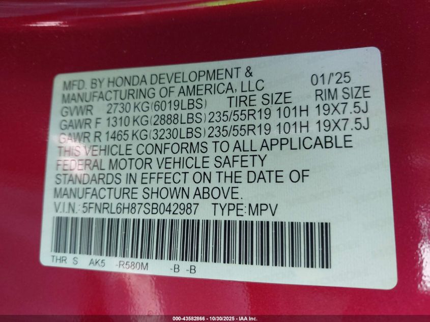 2025 HONDA ODYSSEY 2025 року Бензин, 3.5, Передній привід, vin - 5FNRL6H87SB042987 з США