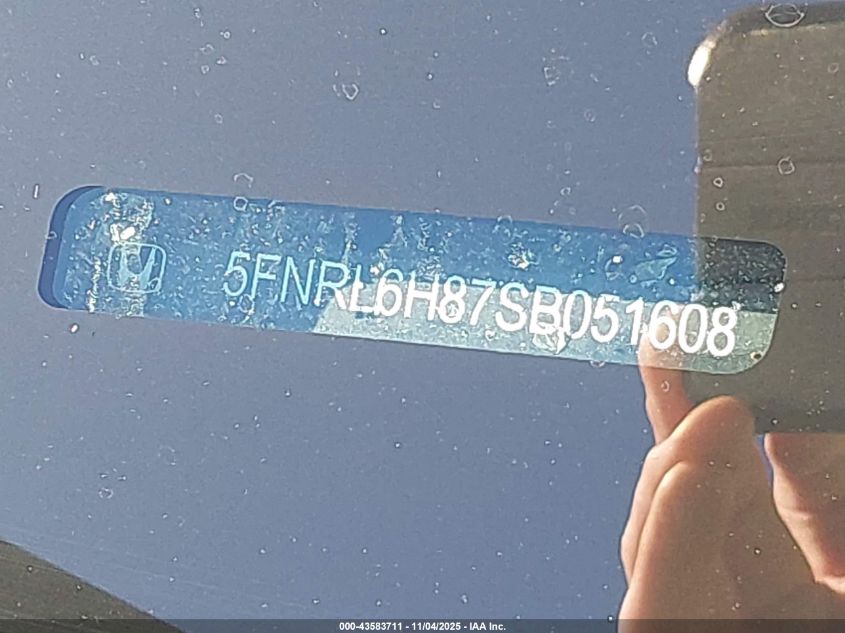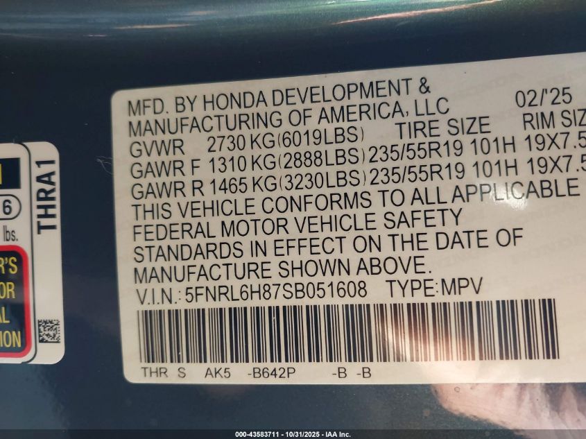 2025 HONDA ODYSSEY 2025 року Бензин, 3.5, Передній привід, vin - 5FNRL6H87SB051608 з США