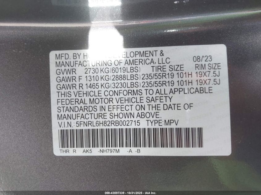 Колір СірийЦиліндри 6Привід Передній привідVIN 5FNRL6H82RB002715Стан СтаціонарноУшкодження Передня або задня AutoRIA