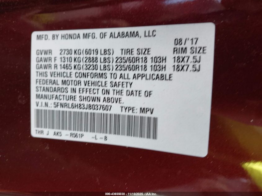 2018 HONDA ODYSSEY 2018 року Бензин, 3.5, Передній привід, vin - 5FNRL6H83JB037607 з США