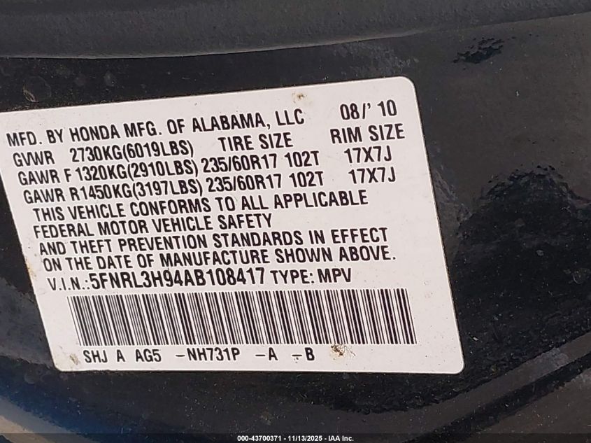 Колір ЧорнийЦиліндри 6Привід Передній привідVIN 5FNRL3H94AB108417Стан СтаціонарноУшкодження З боківДата аукціону 2025-12-11 AutoRIA