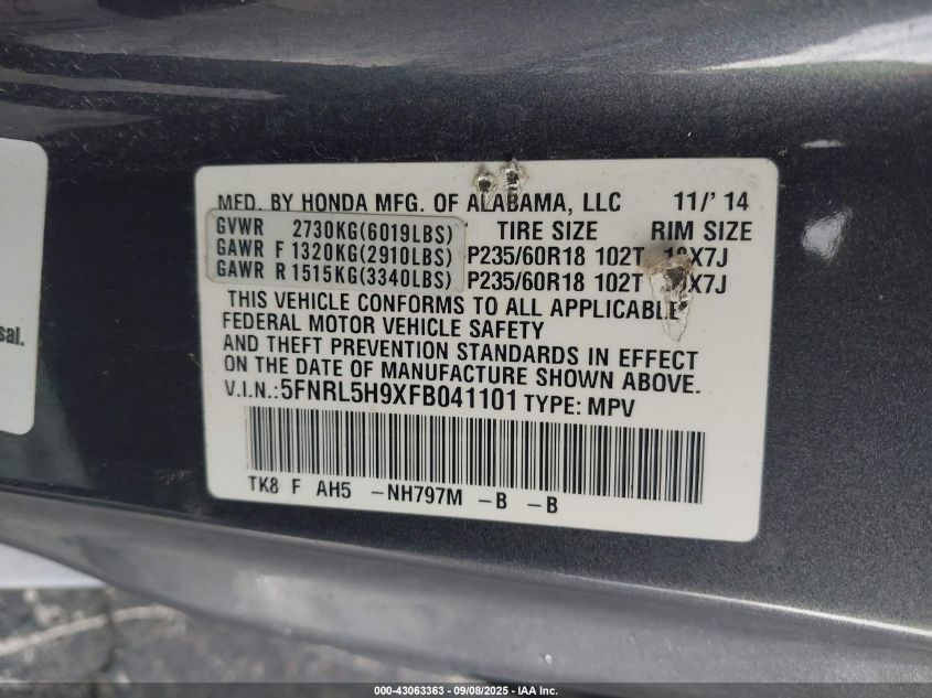 Колір СірийЦиліндри 6Привід Передній привідVIN 5FNRL5H9XFB041101Стан Заводиться та їде (перевірено)Ушкодження Задня AutoRIA