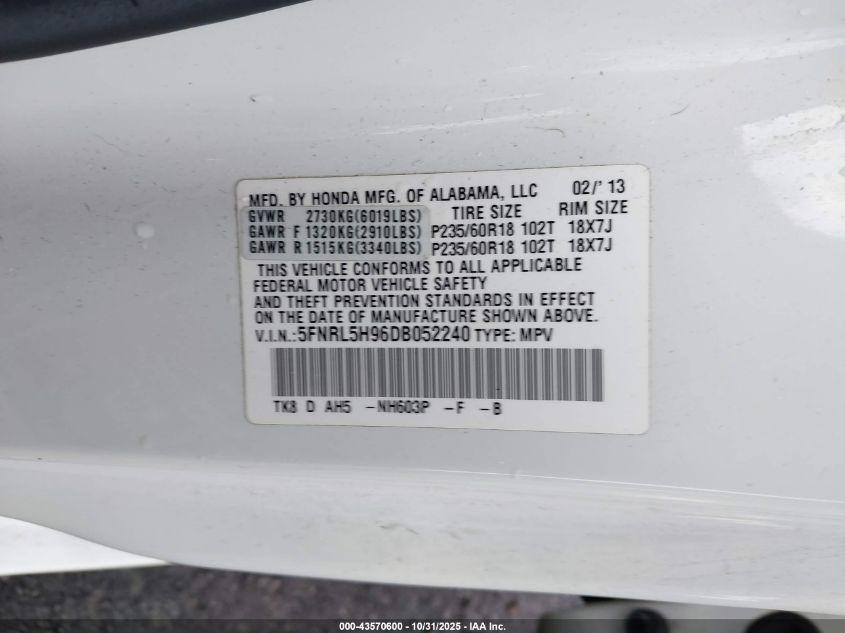 Колір БілийЦиліндри 6Привід Передній привідVIN 5FNRL5H96DB052240Стан Заводиться та їде (перевірено)Ушкодження Передня або задняДата аукціону 2025-12-09 AutoRIA