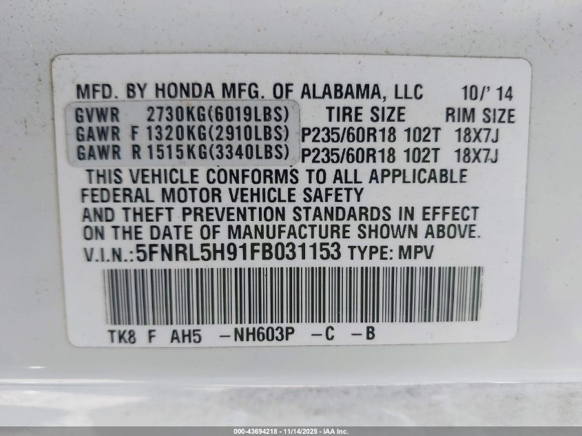 2015 HONDA ODYSSEY 2015 року Бензин, 3.5, Передній привід, vin - 5FNRL5H91FB031153 з США