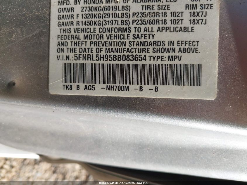 Колір СрібнийЦиліндри 6Привід Передній привідVIN 5FNRL5H95BB083654Стан СтаціонарноУшкодження Звичайний зносДата аукціону 2025-12-08 AutoRIA