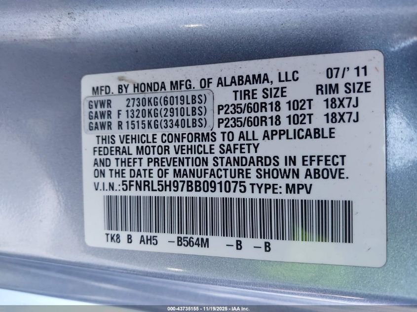 Колір СинійЦиліндри 6Привід Передній привідVIN 5FNRL5H97BB091075Стан Заводиться та їде (перевірено)Ушкодження Передня і задня Дата аукціону 2025-12-10 AutoRIA