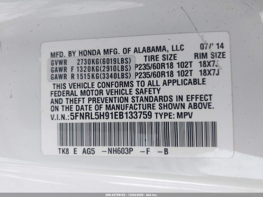 2014 HONDA ODYSSEY 2014 року Бензин, 3.5, Передній привід, vin - 5FNRL5H91EB133759 з США