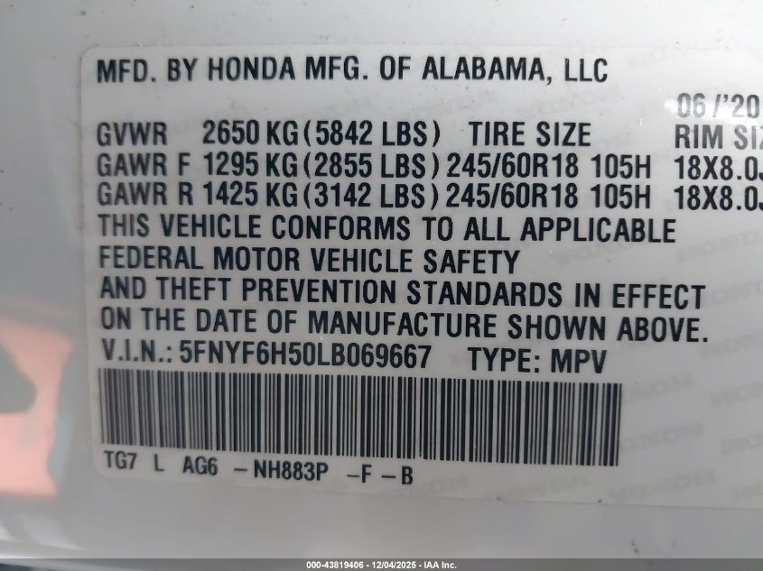 2020 HONDA PILOT 2020 року Бензин, 3.5, Повний привід, vin - 5FNYF6H50LB069667 з США