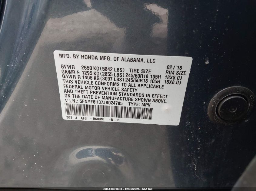 2018 HONDA PILOT 2018 року Бензин, 3.5, Повний привід, vin - 5FNYF6H37JB024785 з США