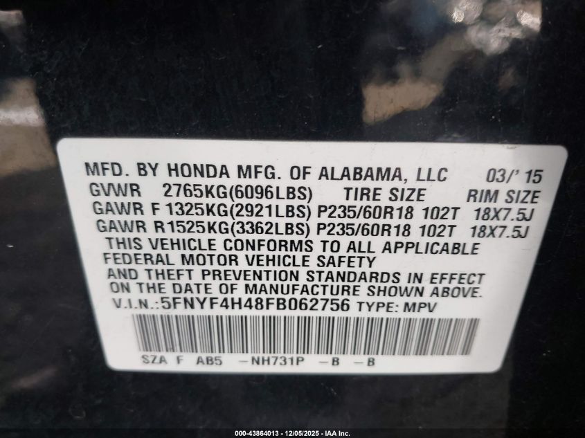 2015 HONDA PILOT 2015 року Бензин, 3.5, Повний привід, vin - 5FNYF4H48FB062756 з США