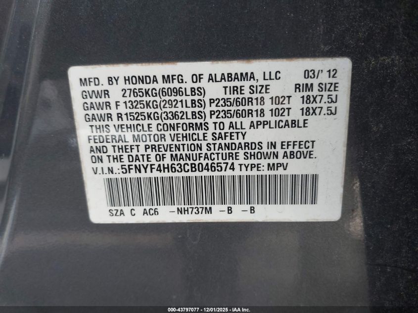 2012 HONDA PILOT 2012 року Бензин, 3.5, Повний привід, vin - 5FNYF4H63CB046574 з США
