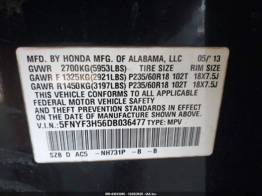 2013 HONDA PILOT 2013 року Бензин, 3.5, Передній привід, vin - 5FNYF3H56DB036477 з США