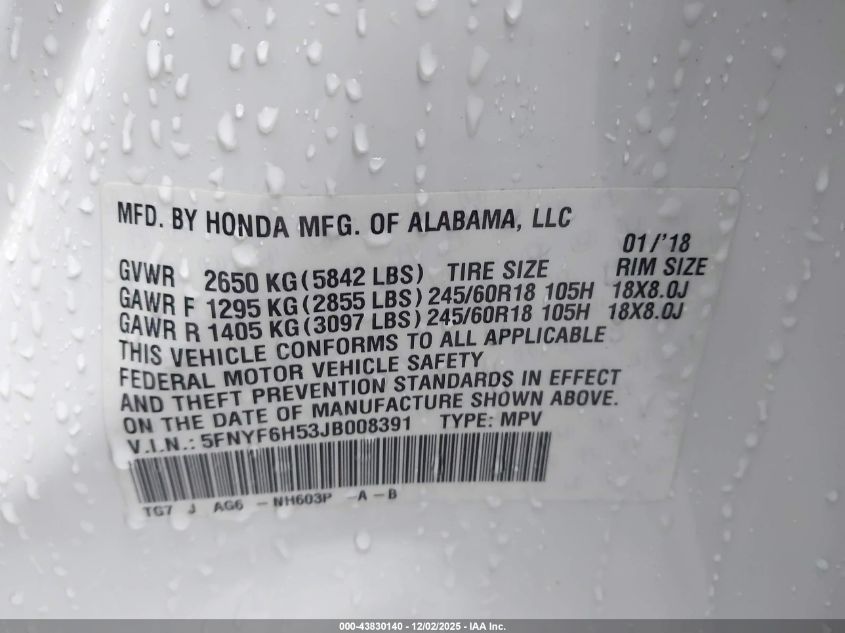 2018 HONDA PILOT 2018 року Бензин, 3.5, Повний привід, vin - 5FNYF6H53JB008391 з США