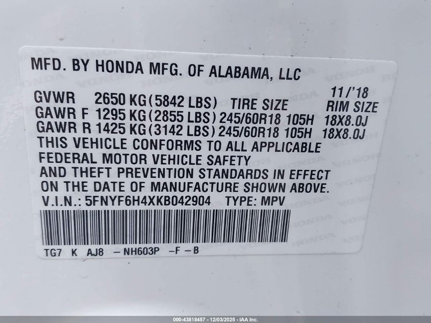 2019 HONDA PILOT 2019 року Бензин, 3.5, Повний привід, vin - 5FNYF6H4XKB042904 з США