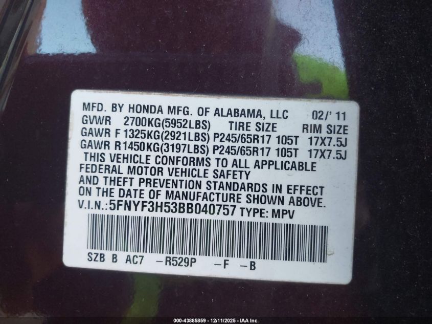 2011 HONDA PILOT 2011 року Бензин, 3.5, Передній привід, vin - 5FNYF3H53BB040757 з США