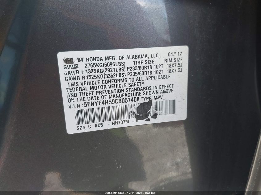 2012 HONDA PILOT 2012 року Бензин, 3.5, Повний привід, vin - 5FNYF4H59CB057408 з США