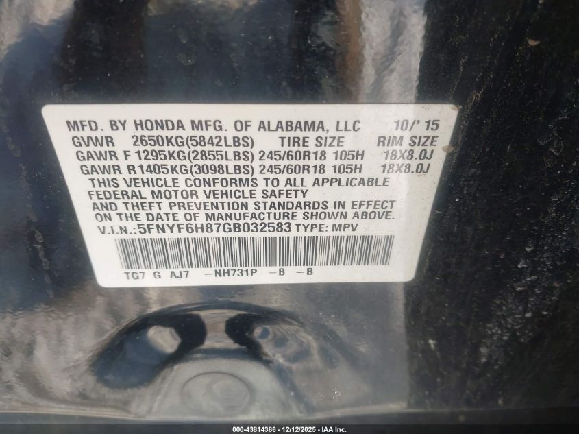 2016 HONDA PILOT 2016 року Бензин, 3.5, Повний привід, vin - 5FNYF6H87GB032583 з США